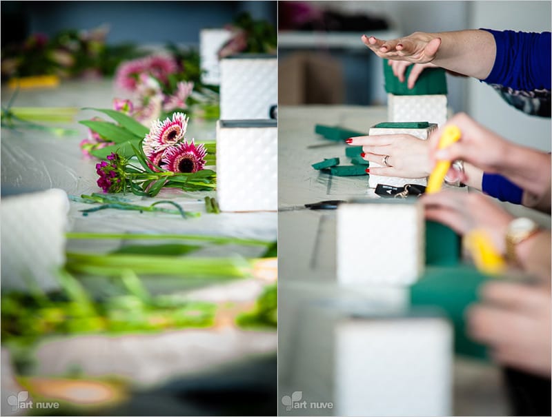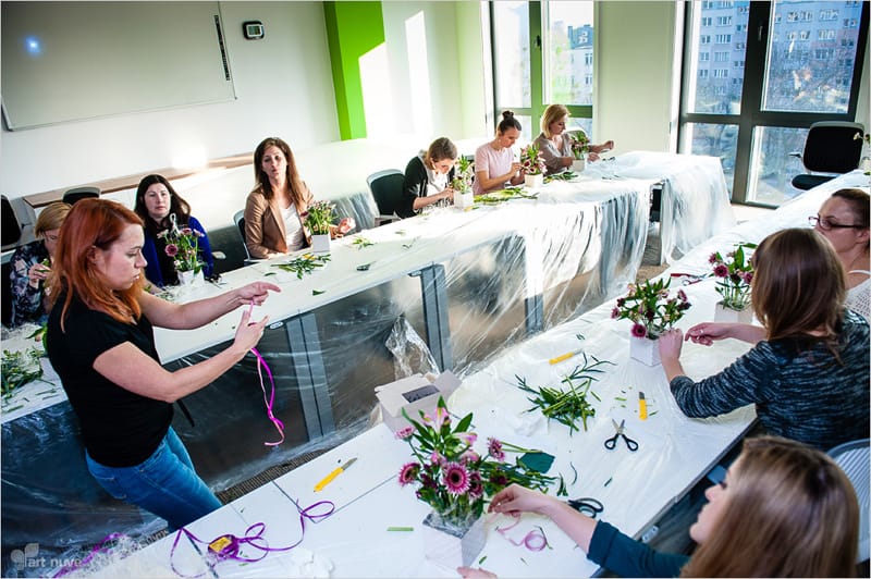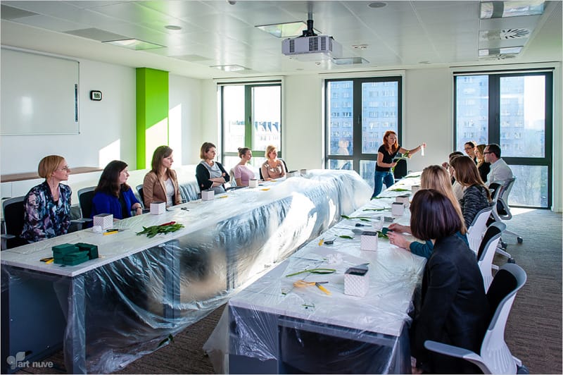 Tym razem nasz Klient postawił na artystyczną formę rozrywki. W ramach spotkania szkoleniowego dla pracowników mieliśmy okazję zorganizować przyspieszony kurs florystyczny. Florystka Agnieszka Mitko-Kominek zdradziła uczestnikom, jak w prosty i przyjemny sposób zrobić mały element dekoracyjny, który cieszy oko. Wszyscy uczestnicy z wielkim uśmiechem na ustach wymyślali przeróżne kompozycje kwiatowe, bardzo dobrze się przy tym bawiąc.